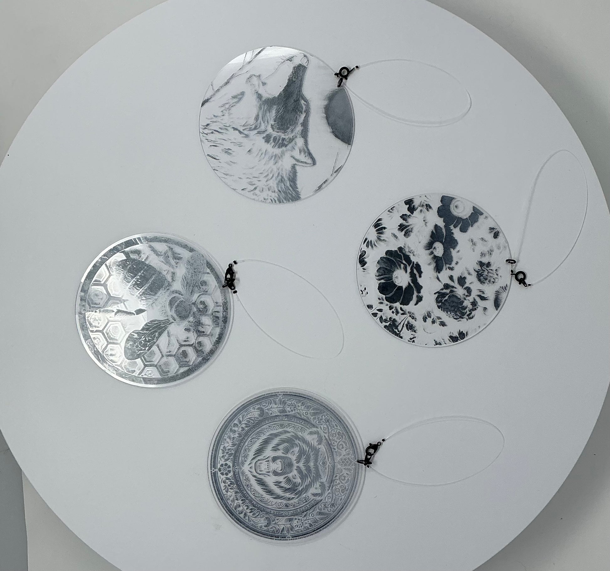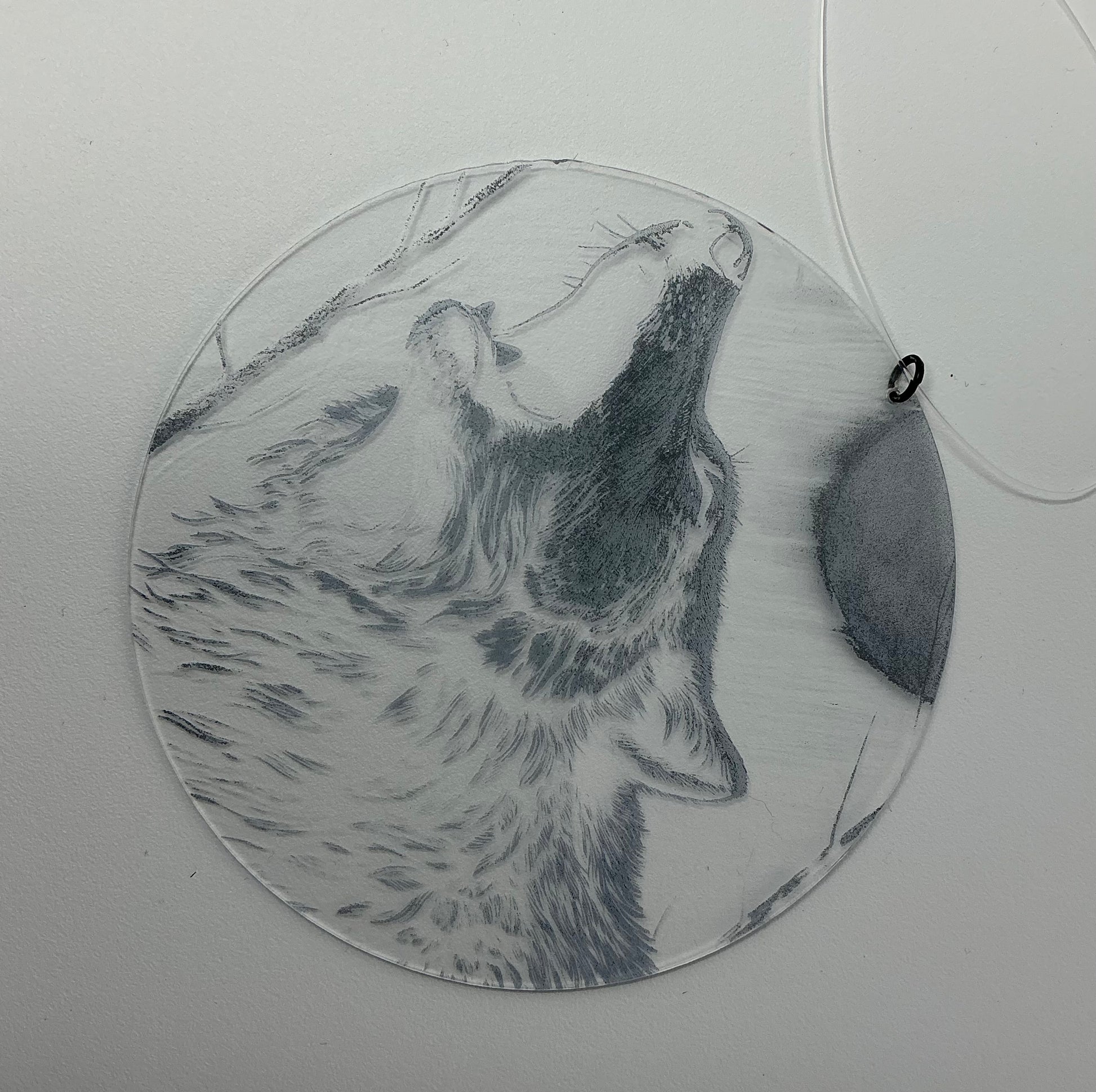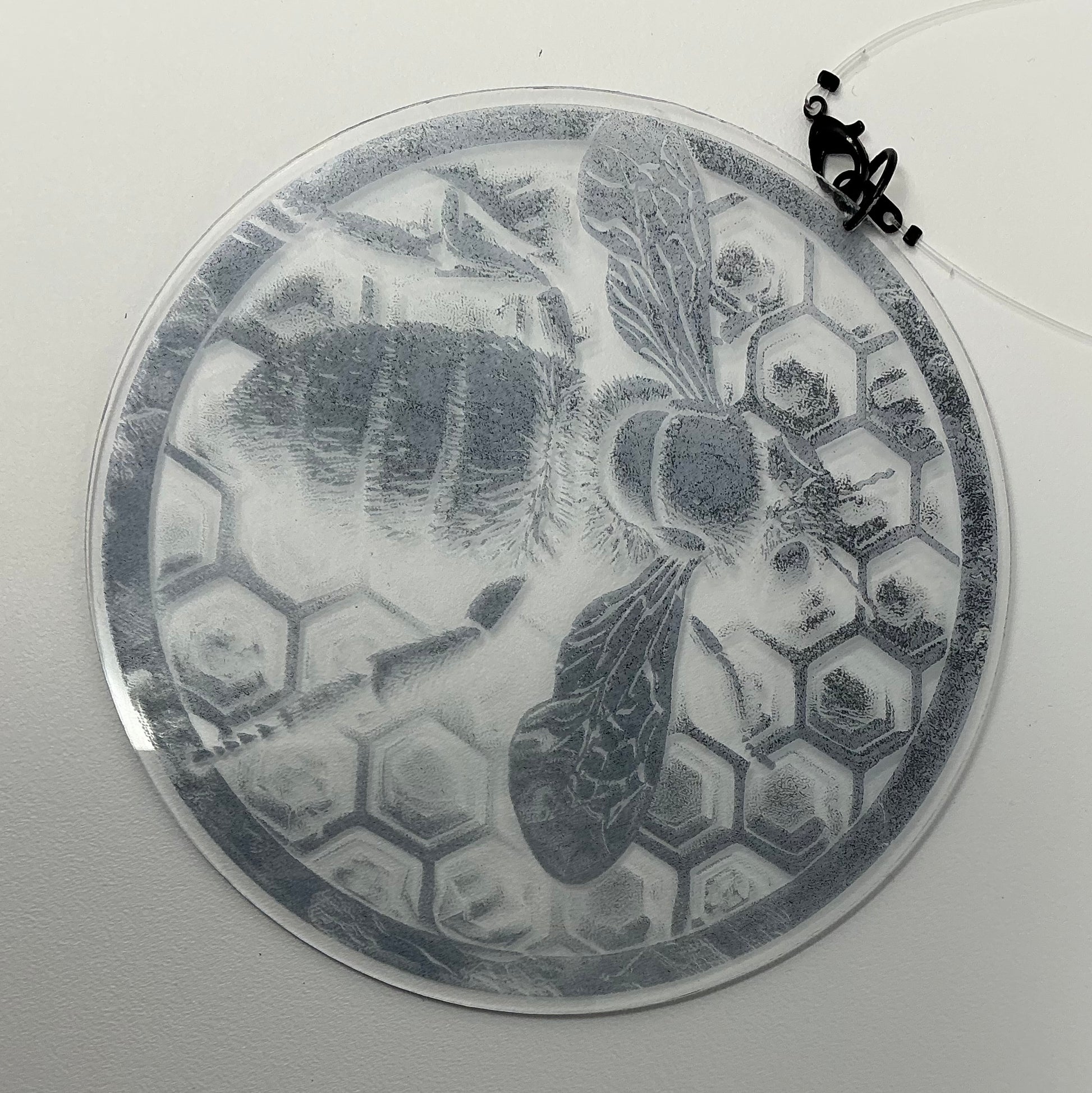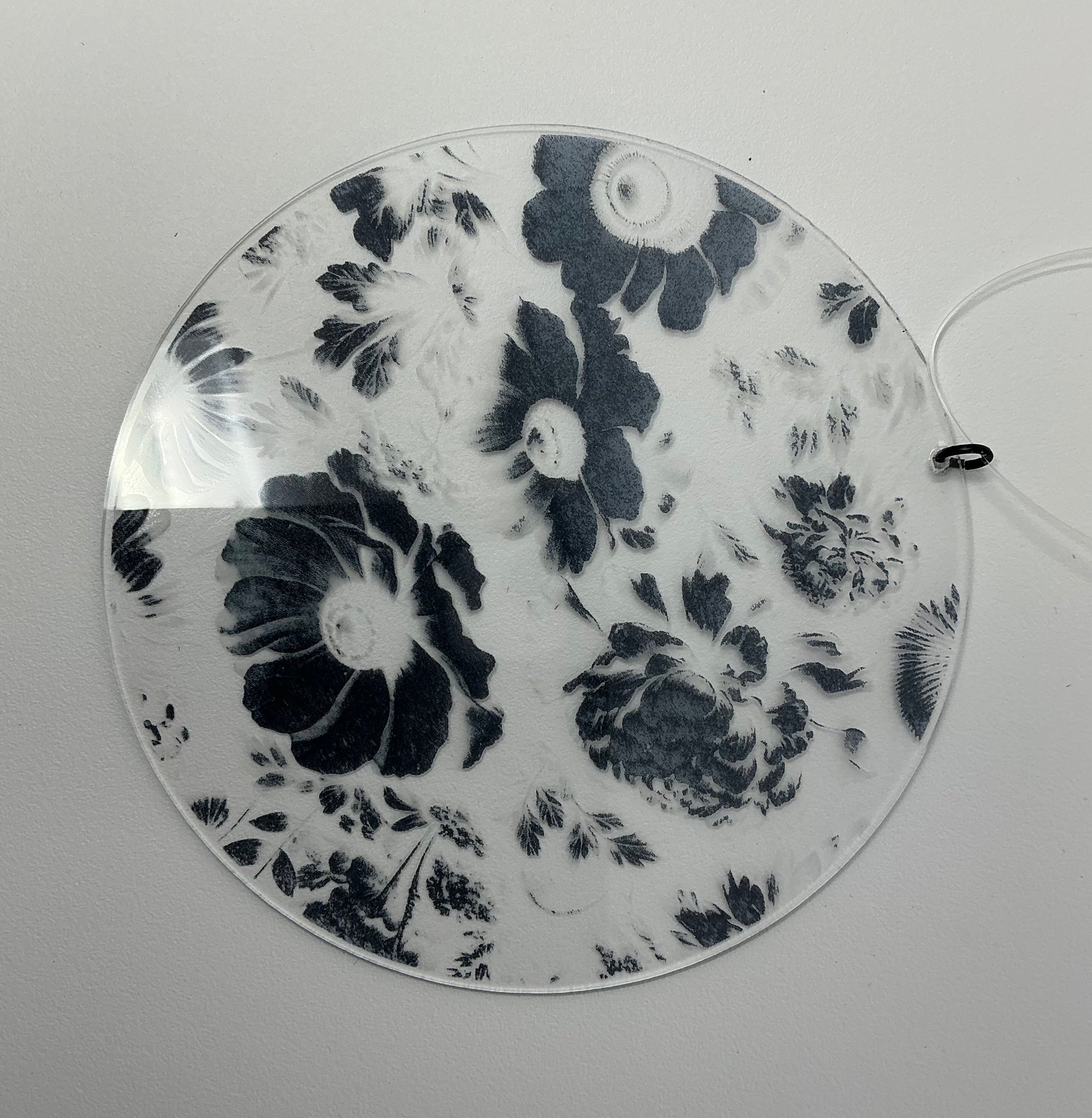 Clear Acrylic disk, 4” diameter. Clasp hanger. Great to hang in a window or rear view mirror.