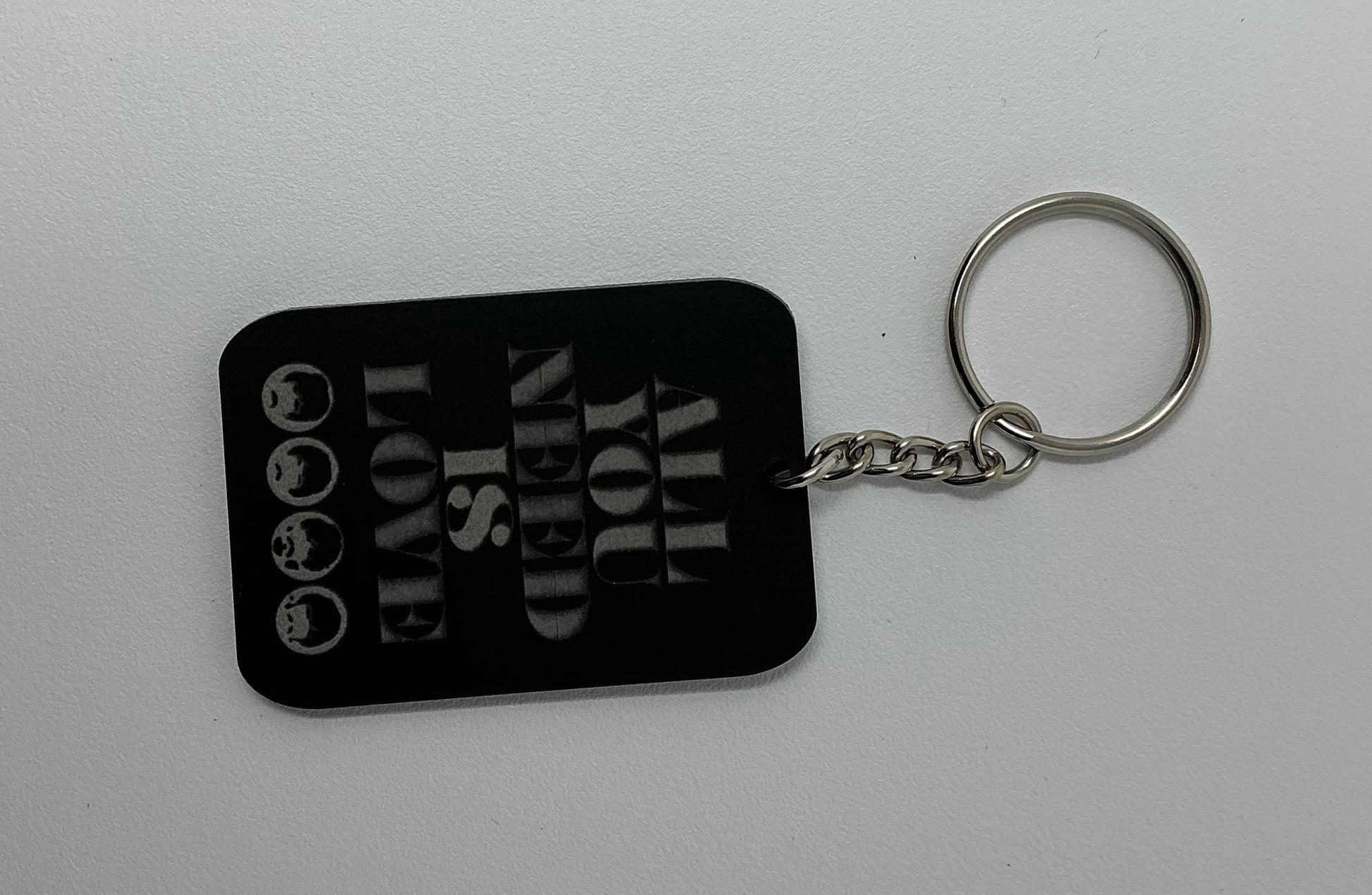 Acrylic key chain, various sizes. 2.5” x .05” to 2” x 1.5”. Can be made in other colours and designs. Engraving to personalize.
